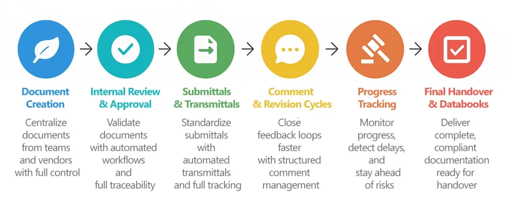 Replace fragmented tools with a single platform for document control, submittals, reviews, and compliant delivery.